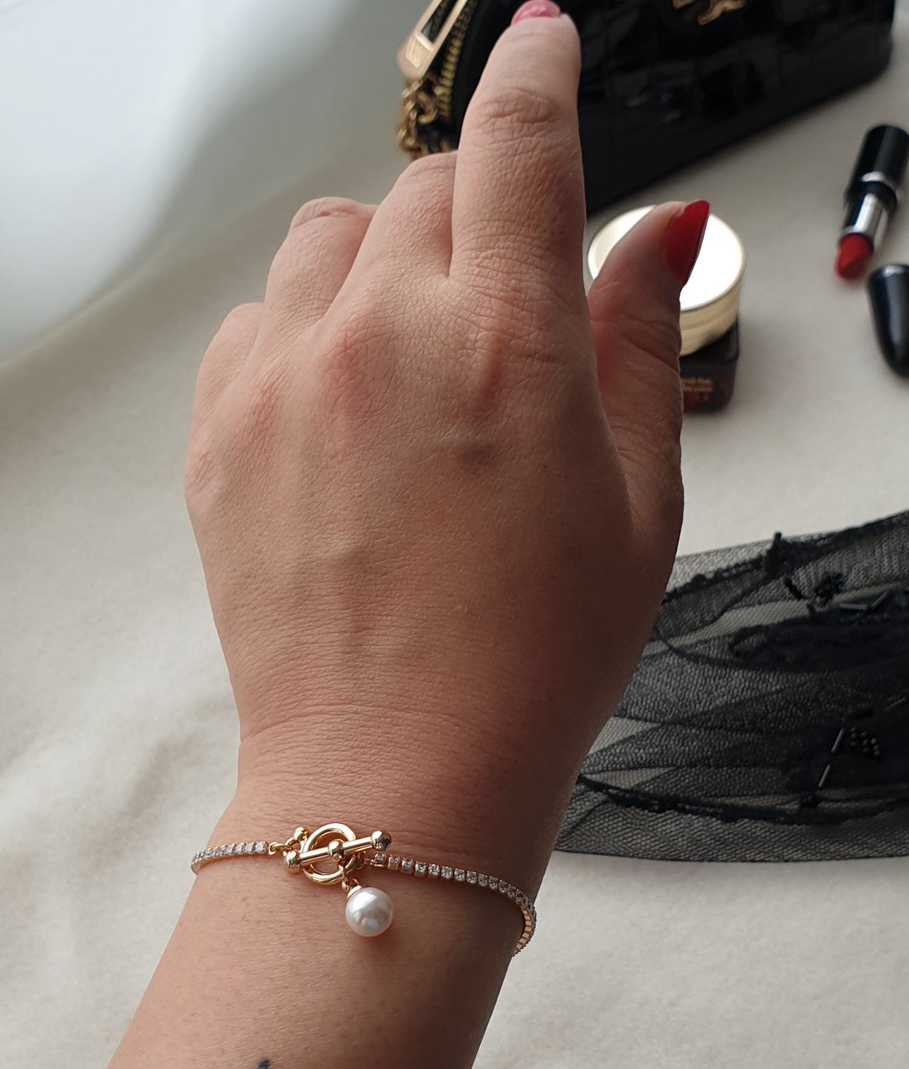 دستبند زنانه تنیسی ژوپینگ طرح طلا به همراه مروارید وقفل تی دررخسار سیلور