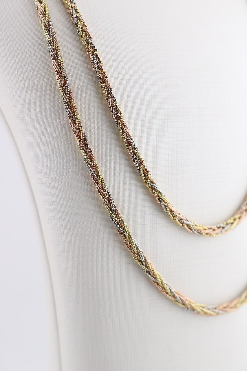 گردنبند سه رنگ بافته شده نقره ایتالیایی ترکیب هنرمندانه از ظرافت و دوام.ساخته شده از نقره ایتالیایی با عیار بالا و طراحی منحصر به فرد.بافت این سرویس درخششی خاص به استایل شما می بخشد و با ترکیب رنگ های نقره ،طلایی و رزگلد هماهنگی کامل با انواع جواهرات را به ارمغان می آورد.انتخابی اشرافی برای کسانی که به دنبال تفاوت هستند.