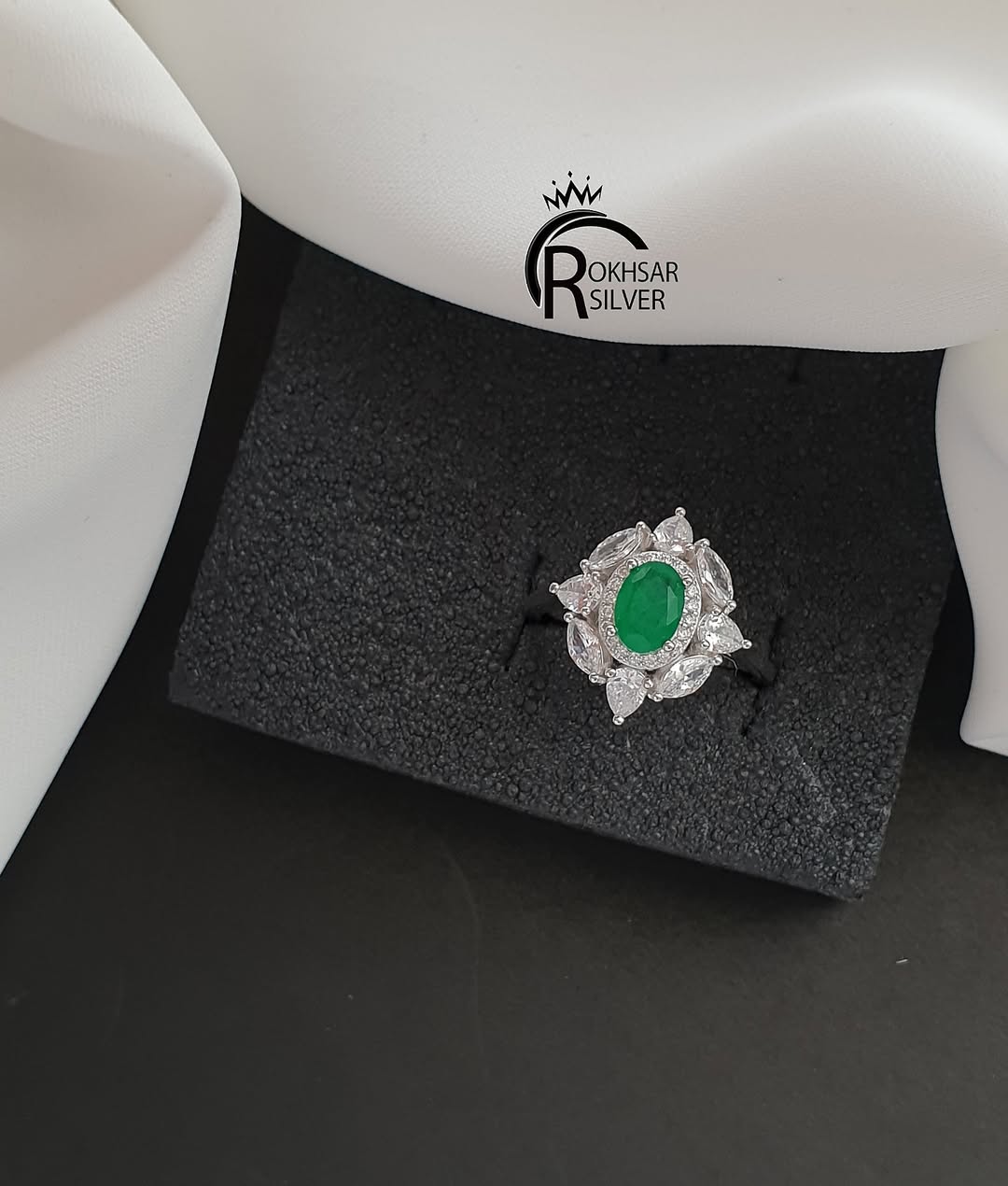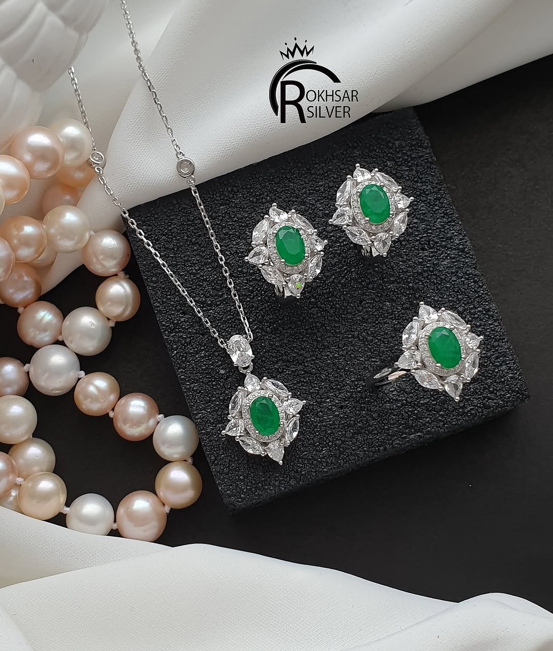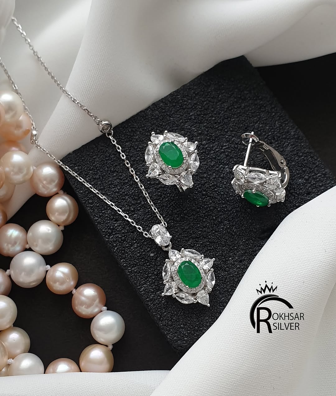 ست نقره جواهری زنانه مدل تاج با سنگ زمرد اصل و قیمتی و با عیار ۹۲۵و گارانتی در رخسار سیلور