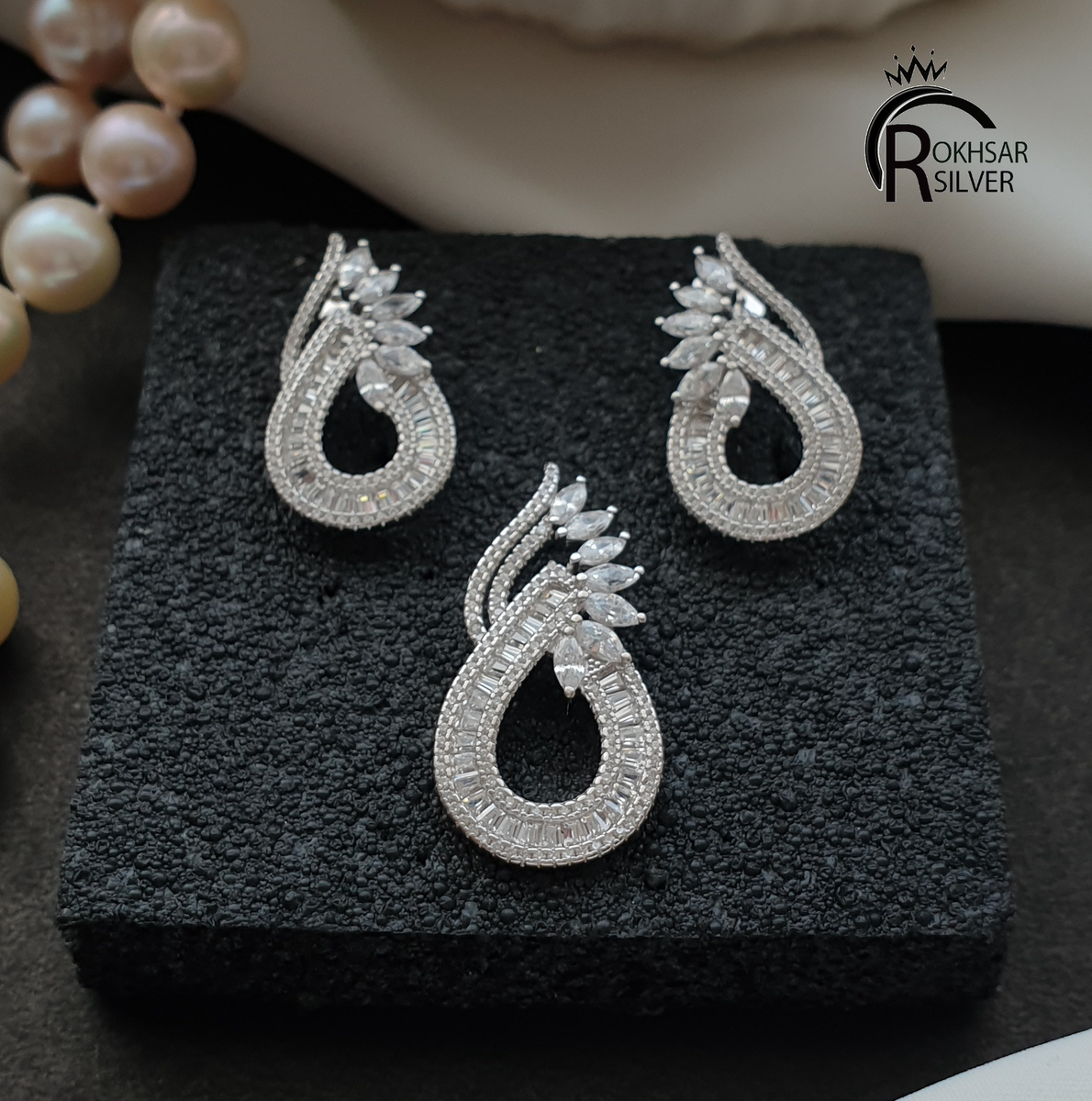 این ست ،نقره اصل وبا عیار ۹۲۵وبا فاکتور رسمی وضمانت است تمام نگینها مخراج شده و یکست لوکس وفاخر است ومناسب استفاده مداوم است. این ست شامل پلاک وگوشواره میخی است و سایزش مدیوم بوده