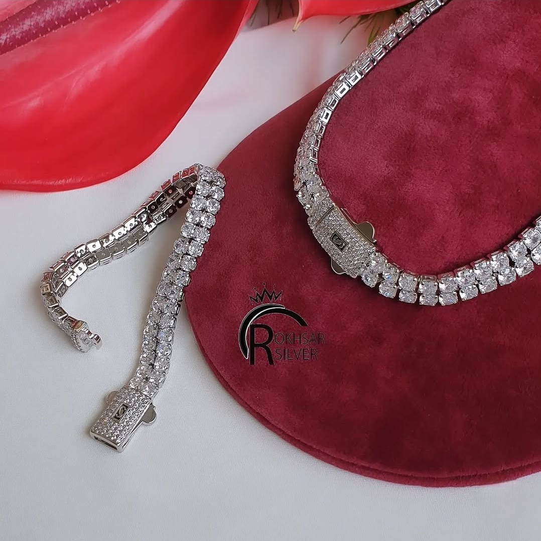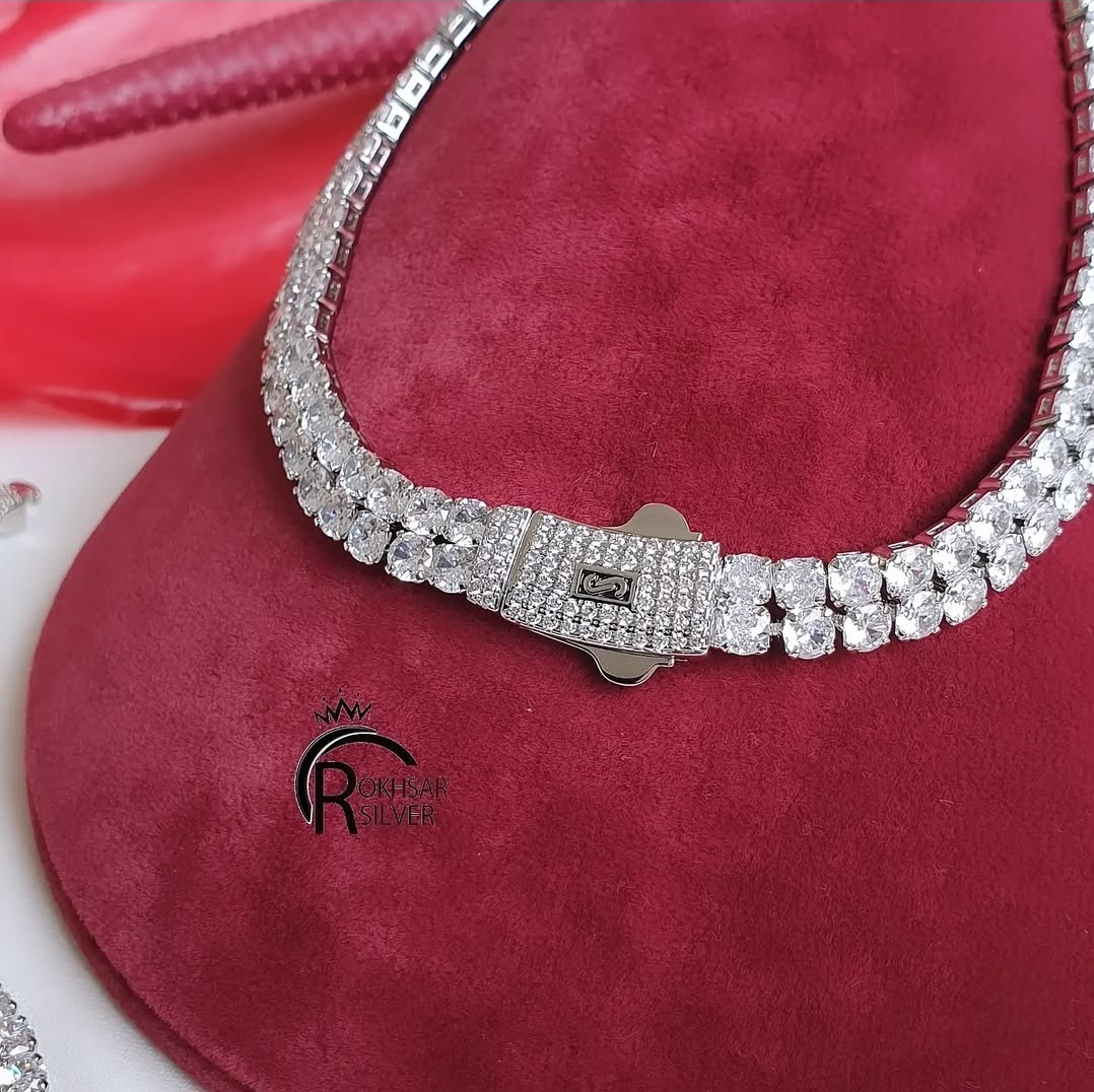 نیمست زنانه تنیسی درشت با نگینهای بزرگ و درخشان، انتخابی لوکس و پرجلوه برای استایلهای مجلسی و مهمانیها است. این نیمست شامل گردنبند و دستبند هماهنگ بوده و طراحی پر و چشمگیر آن، استایل شما را فوقالعاده جذاب و جواهری نشان میدهد.