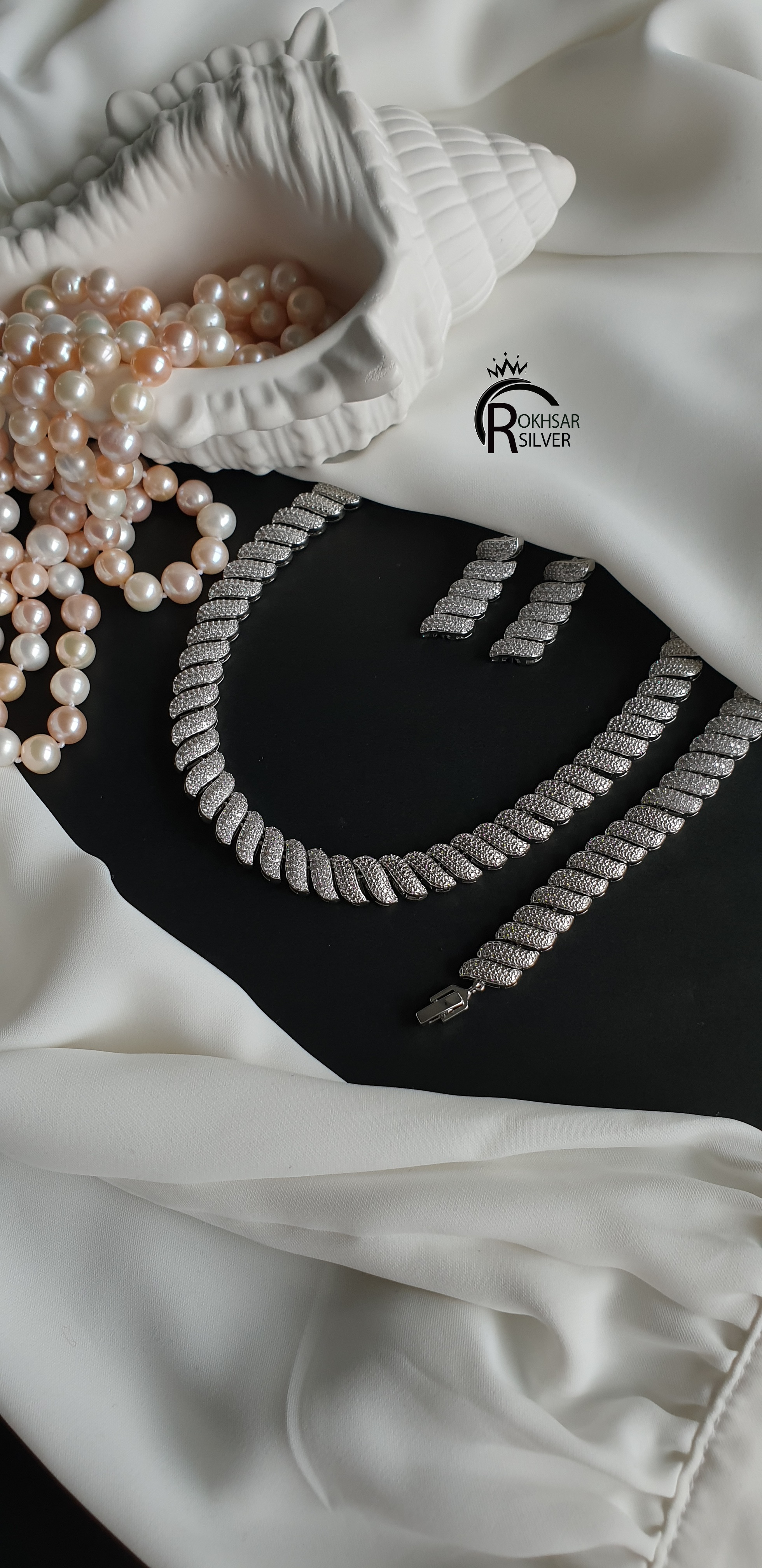 بلندی گردنبند کاملا استانداره و ۴۵سانت است و سرویس شامل گردنبند فول نگین و دستبند و گوشواره آویز است