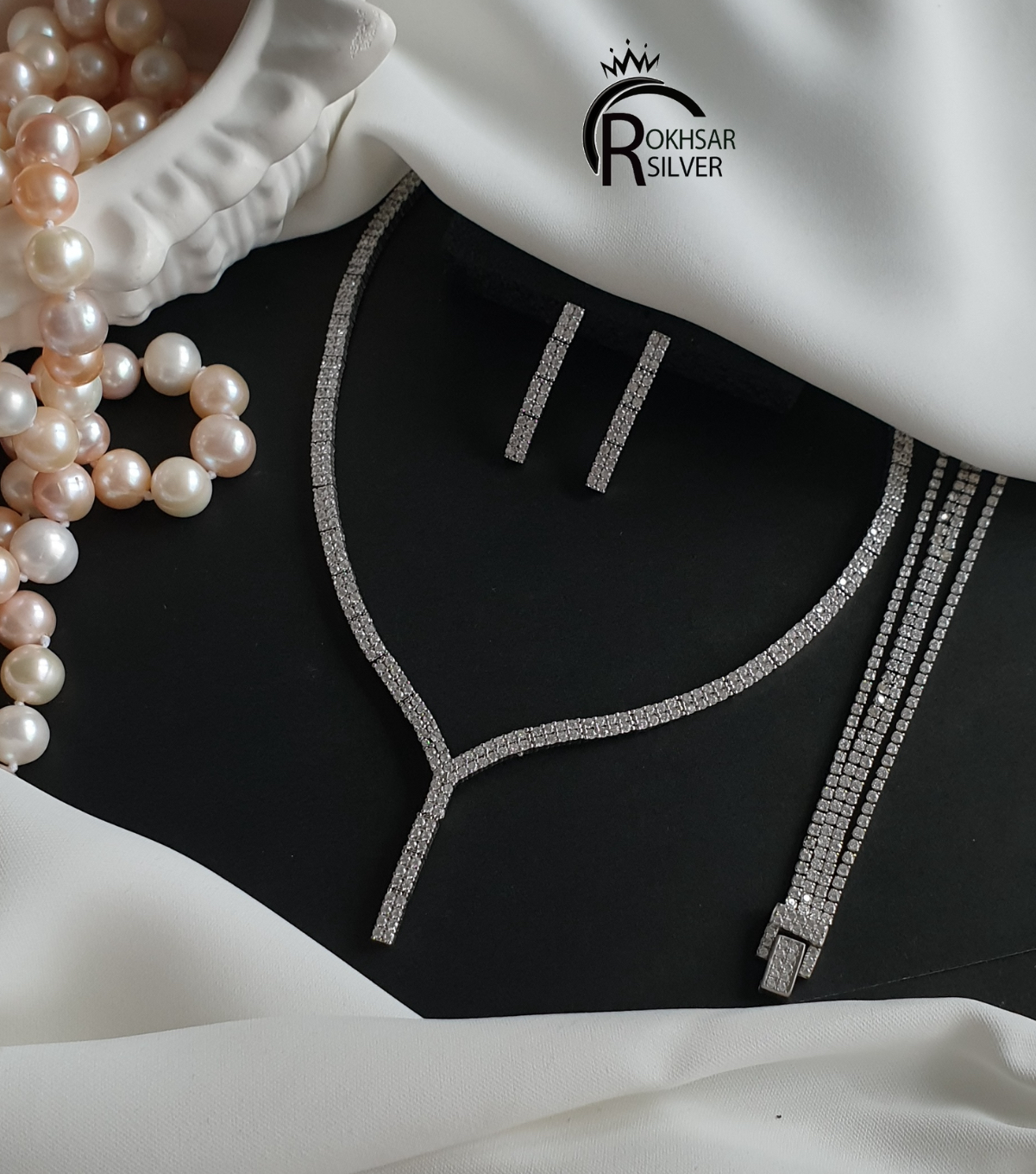 این سرویس با عیار ۹۲۵و فاکتور رسمی و ضمانت تقدیم میشود و با آبکاری رادیوم است و نوع نگینها اتمی و سوپر استار هستند که درخششان بی نظیره .قسمت وسط کار تنیسی کار شده و پشت گردن بافت ساده نقره دارد و دستبند تنیس سه رج است