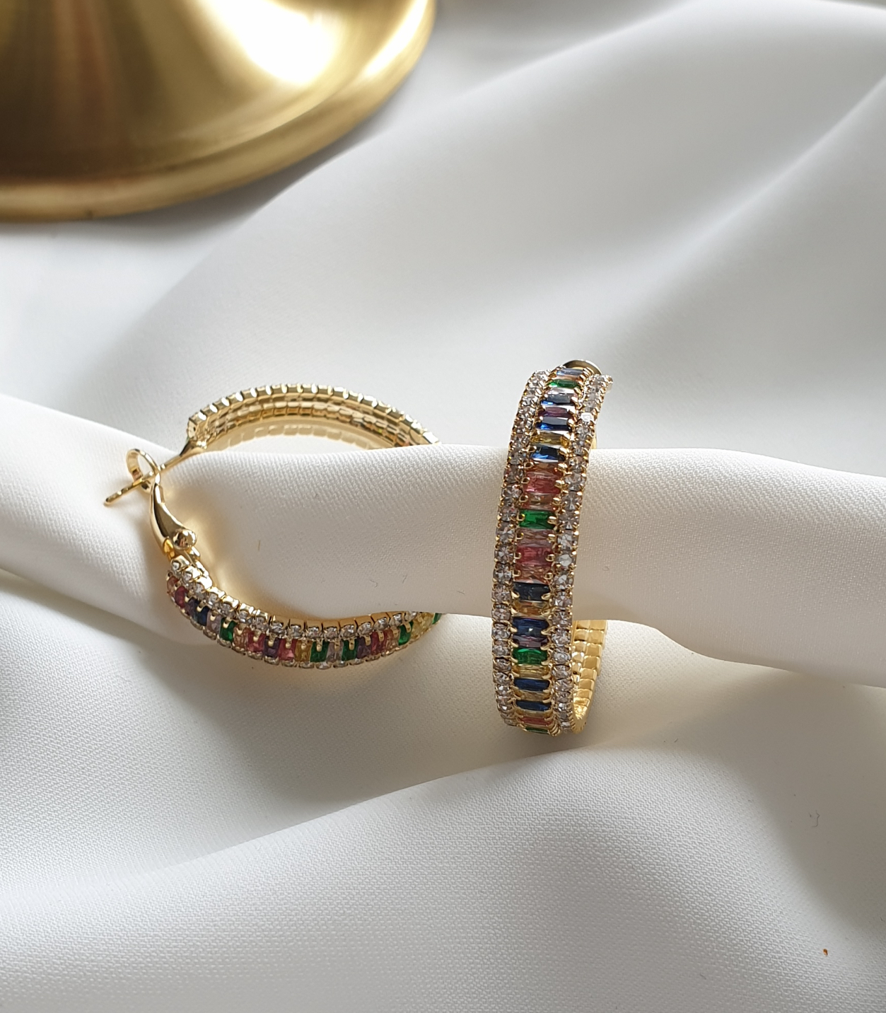 گوشواره حلقه ای زنانه وارداتی با کریستالهای رنگی و مولتی کالر با طراحی خاص از برند رخسار سیلور