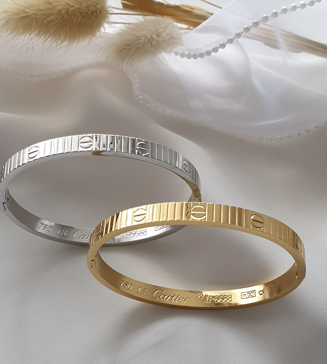 این بنگل استیل اصل 316Lمیباشد و رنگ ثابت و مناسب استفاده مداوم است و این کار آبکاری طلا شده و در داخل کار حک برند و عیار ۷۵۰طلا خورده این طرح جدید کارتیر از طراحی جدید ۲۰۲۵است