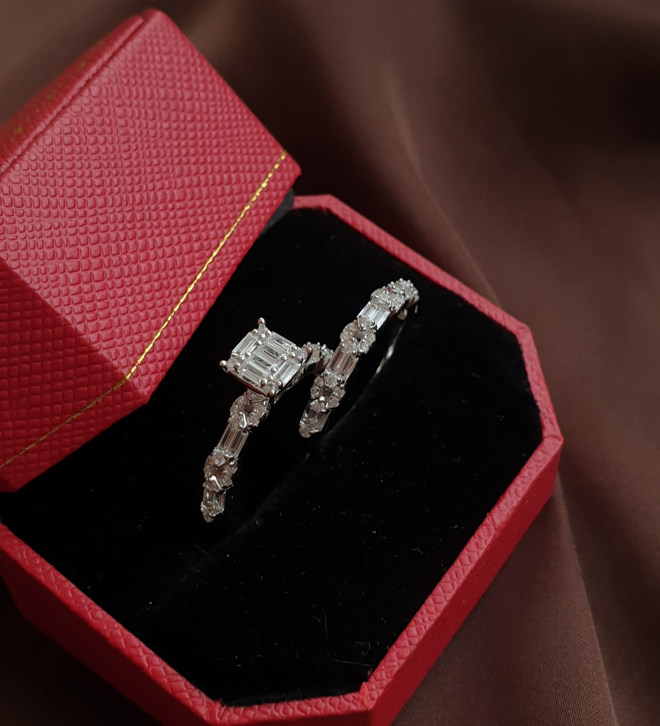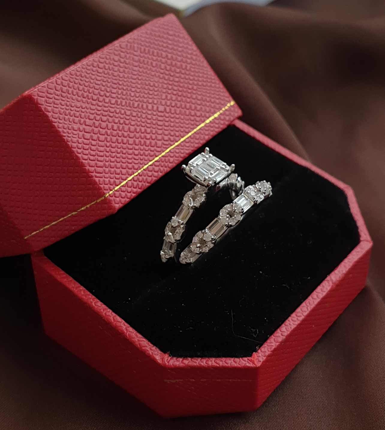 انگشتر حلقه وپشت حلقه جواهری نقره ۹۲۵مدل نگین مارکیز خور و اتمی گرد با فاکتور رسمی از برند رخسار سیلور