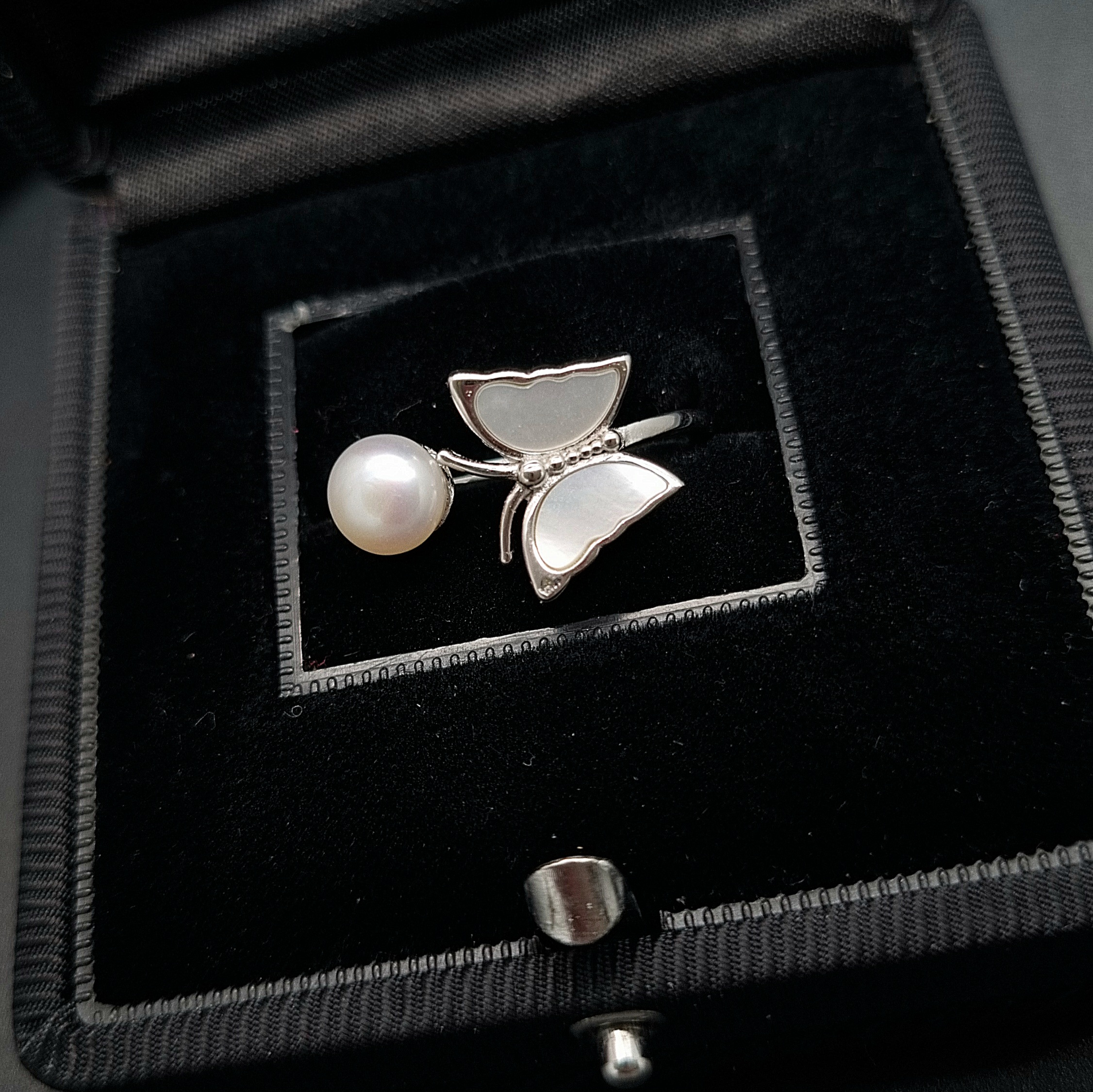 انگشتر زنانه نقره با پروانه صدف طبیعی و مروارید طبیعی با عیار 925 در رخسار سیلور