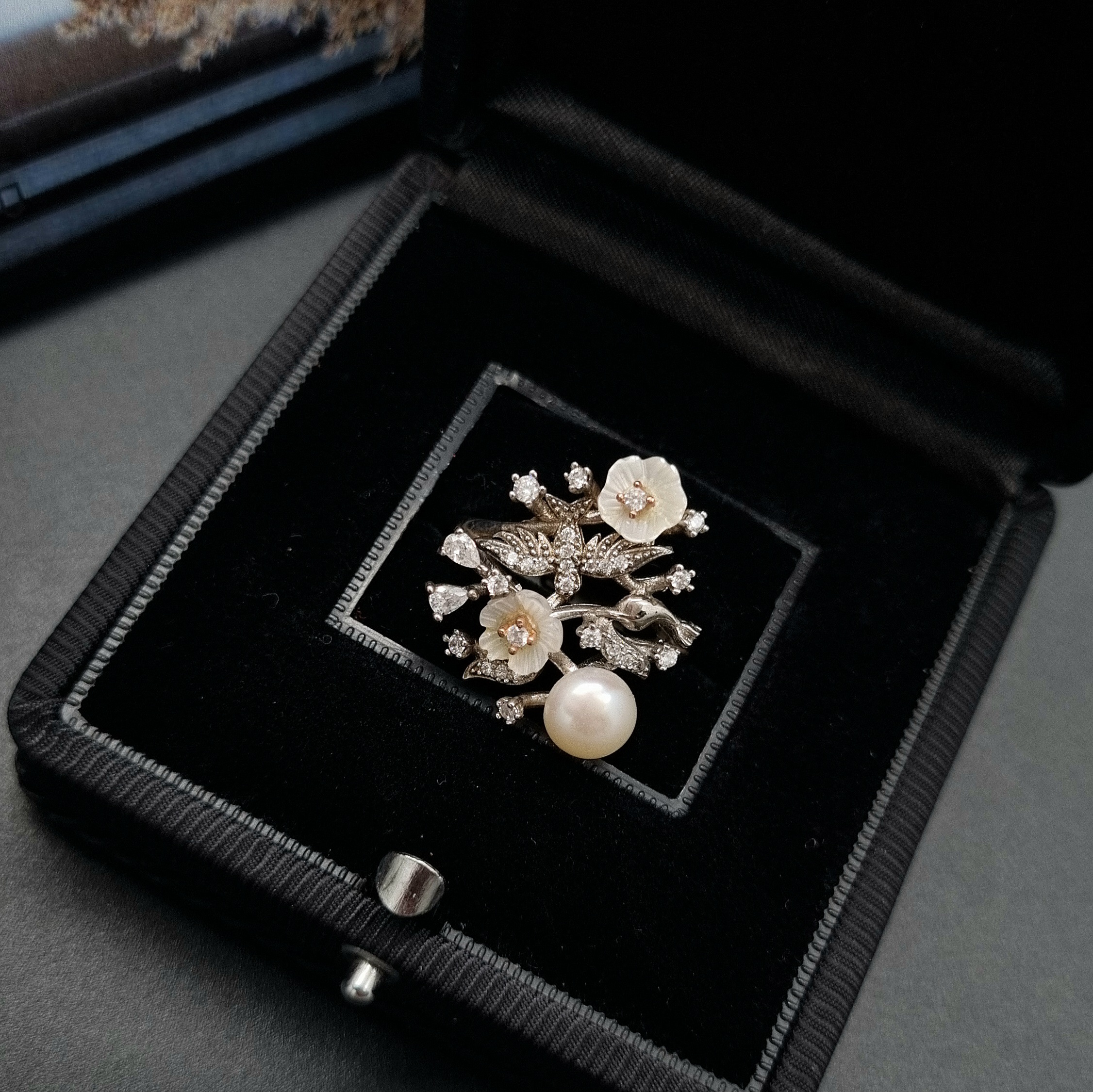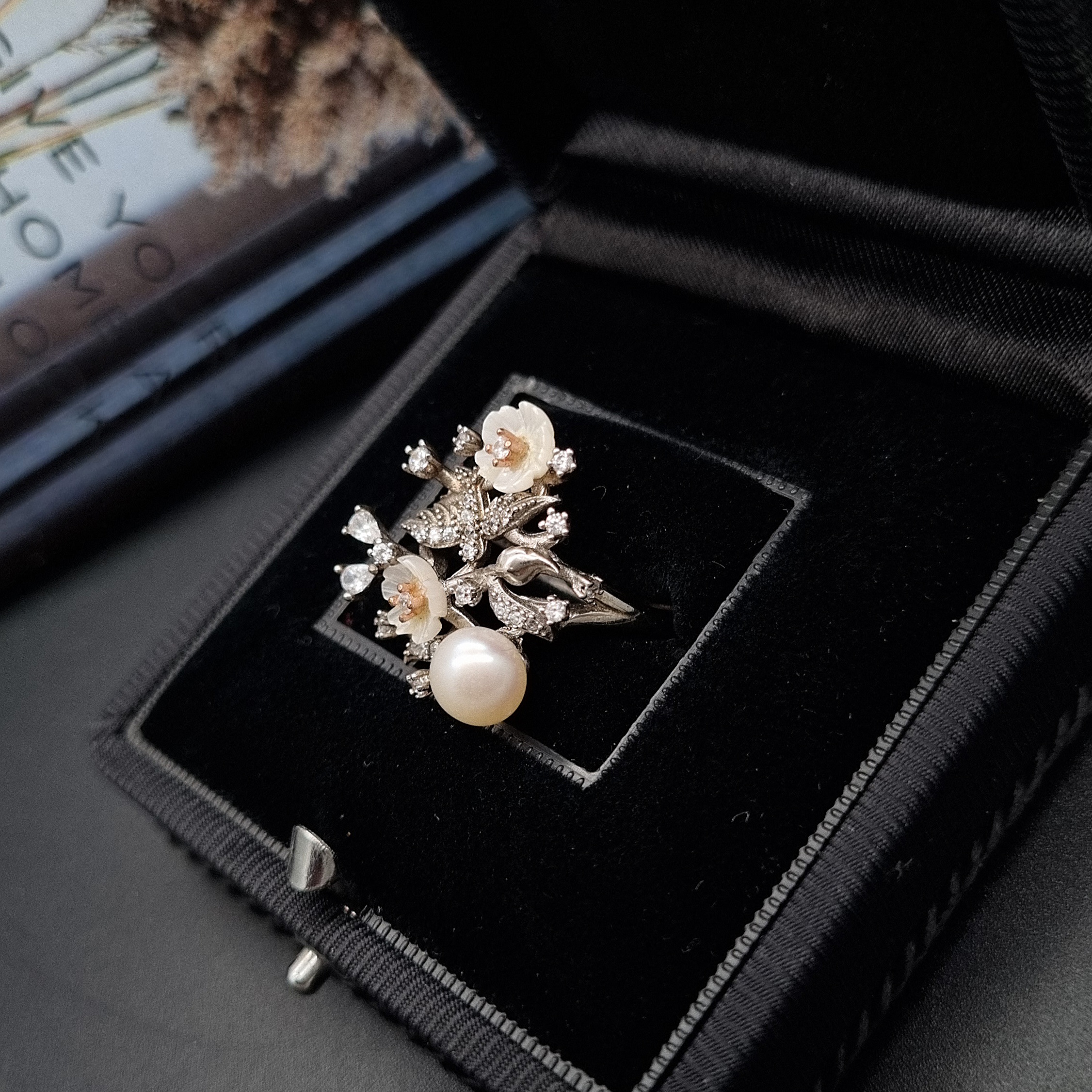 انگشتر زنانه نقره با گل صدف طبیعی و مروارید طبیعی در رخسار سیلور