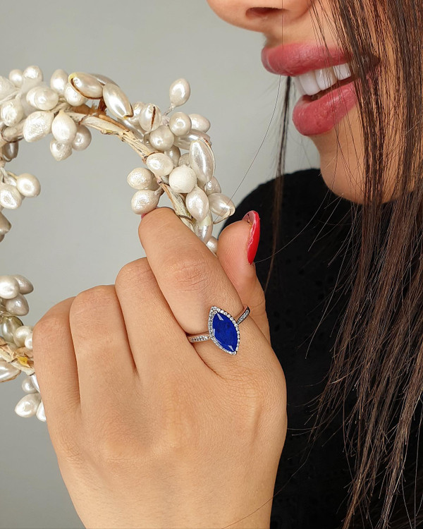 انگشتر نقره لوکس مزین به سنگ لاجورد با فاکتور رسمی و ضمانت کار سنگ کار اصل بوده و نگینهای اطراف کار مخراجکاری واتمی هستند نقره 925 بوده و روکش آب طلا