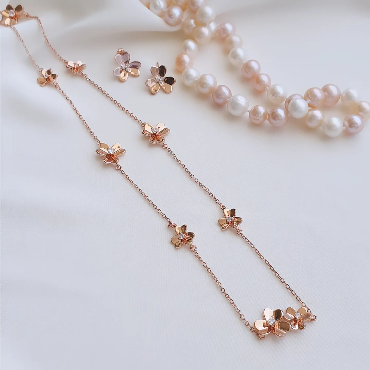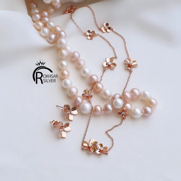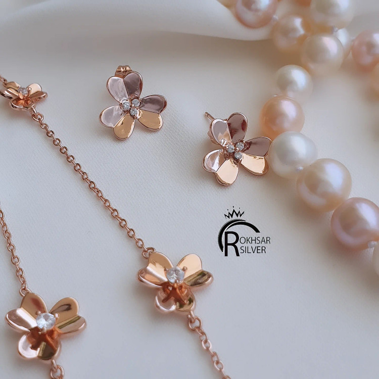 نیم ست زنانه جواهری گل طرح طلا با آبکاری رزگلد مستر در رخسار سیلور